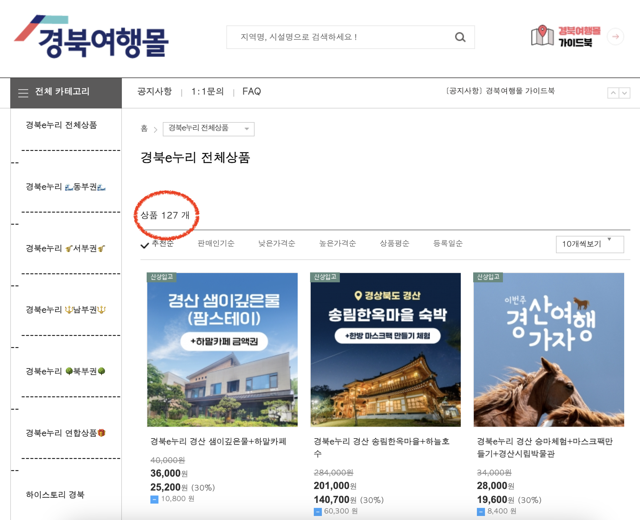 숙박은 물론 여행지와 체험까지 경북지역 상품이 있습니다.