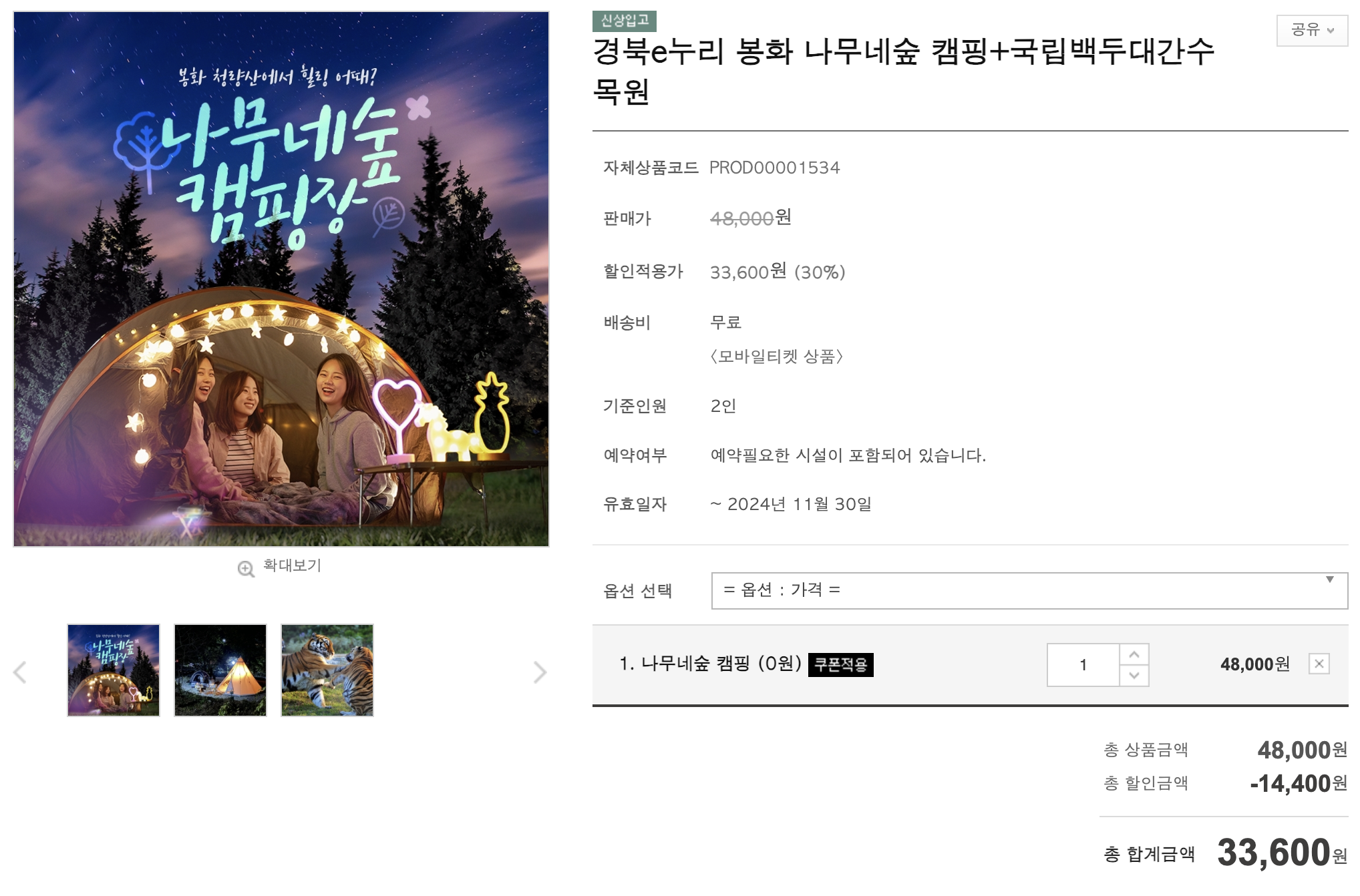 올레!!! 나무네 숲 캠핑 + 국립백두대간수 합해서 33,600원입니다!!!