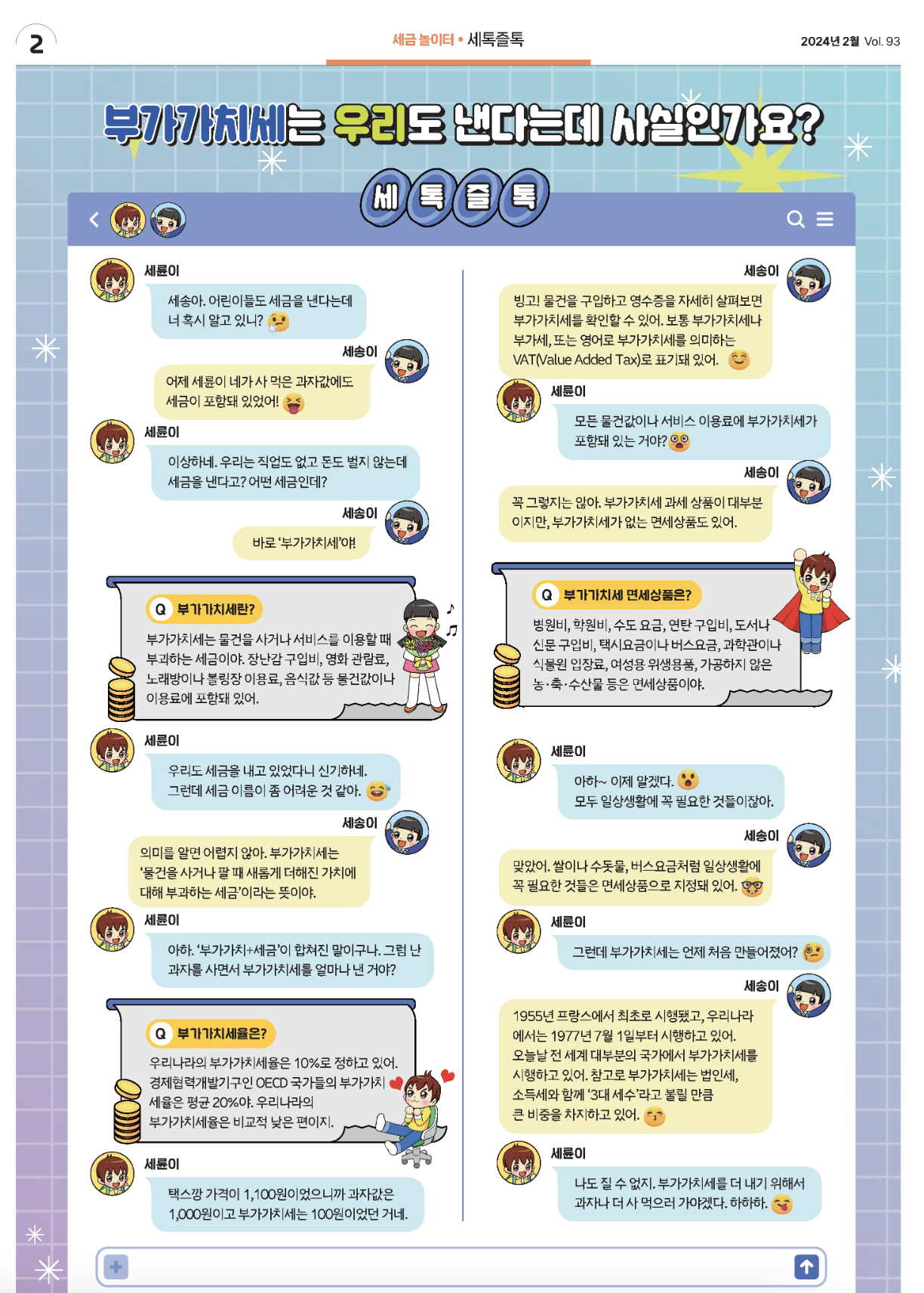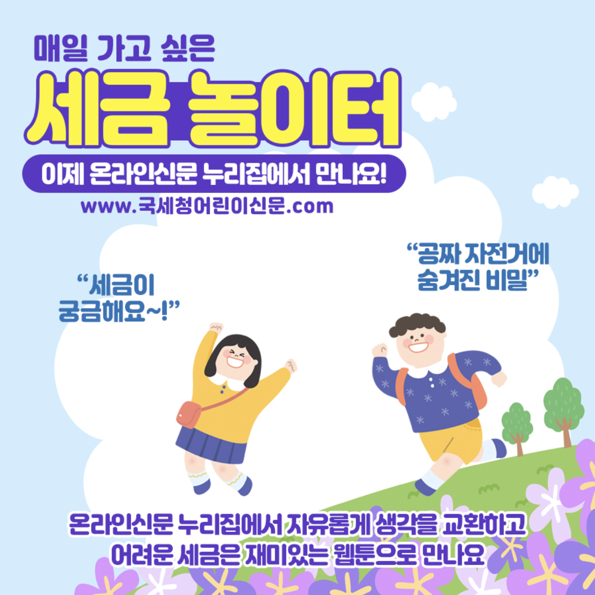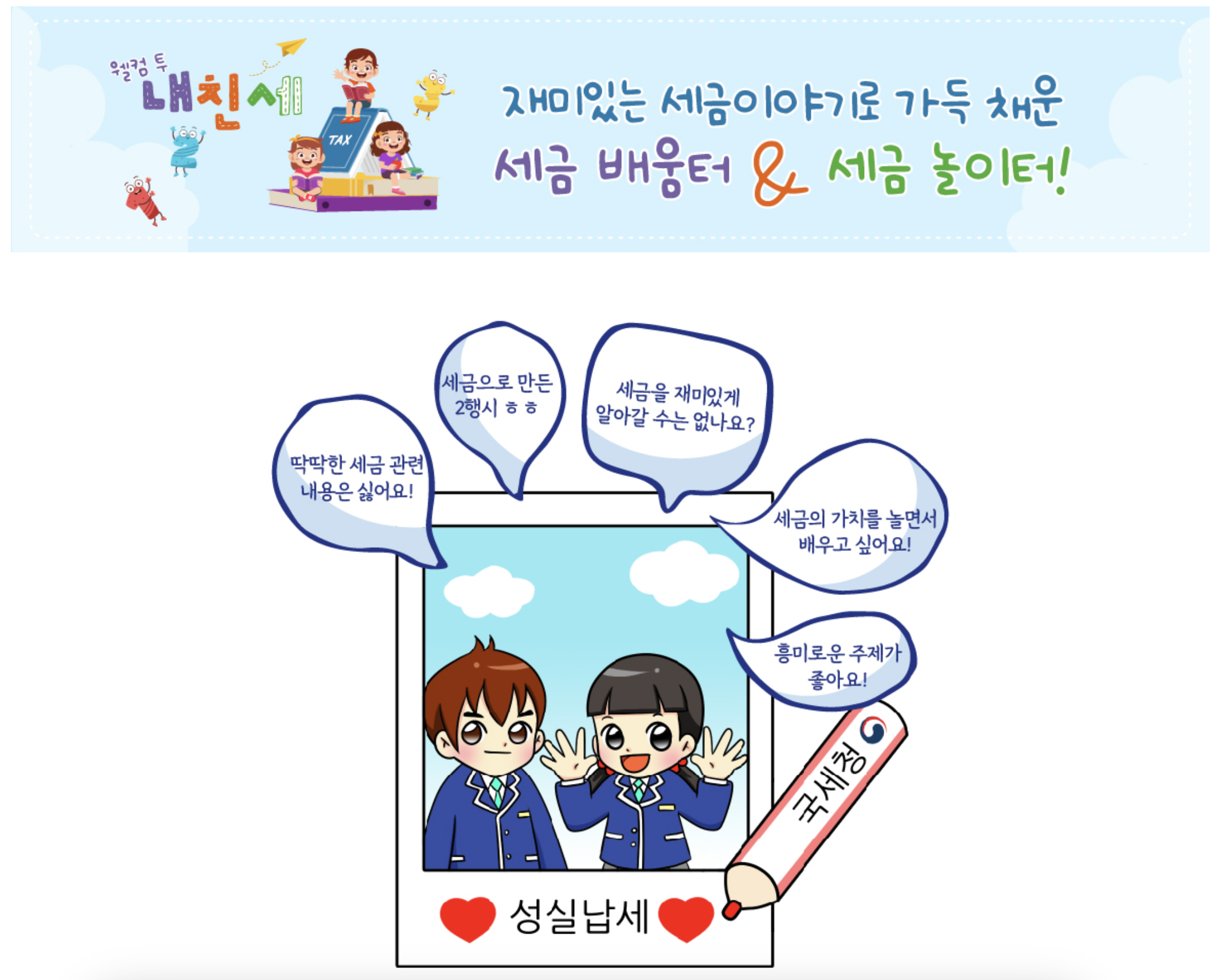 우리 친구들에게 가깝고도 소중한, 그리고 고마운 세금을 쉽게 재미있게 알아갈 수 있는 세금 배움터이자 ,재미있는 세금 놀이터입니다.