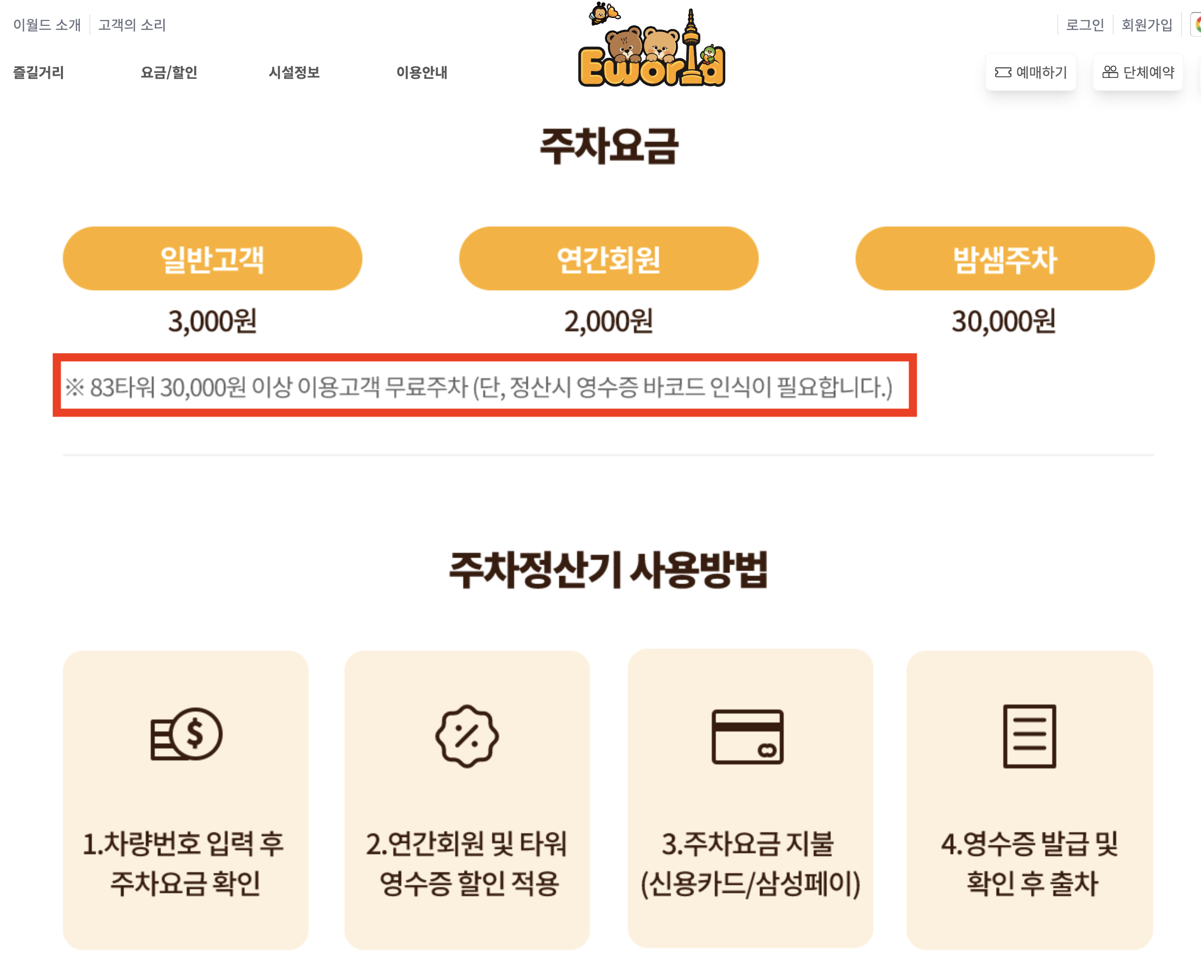 이월드 83타워 30,000원 이상 이용고객 무료주차 가능해요.