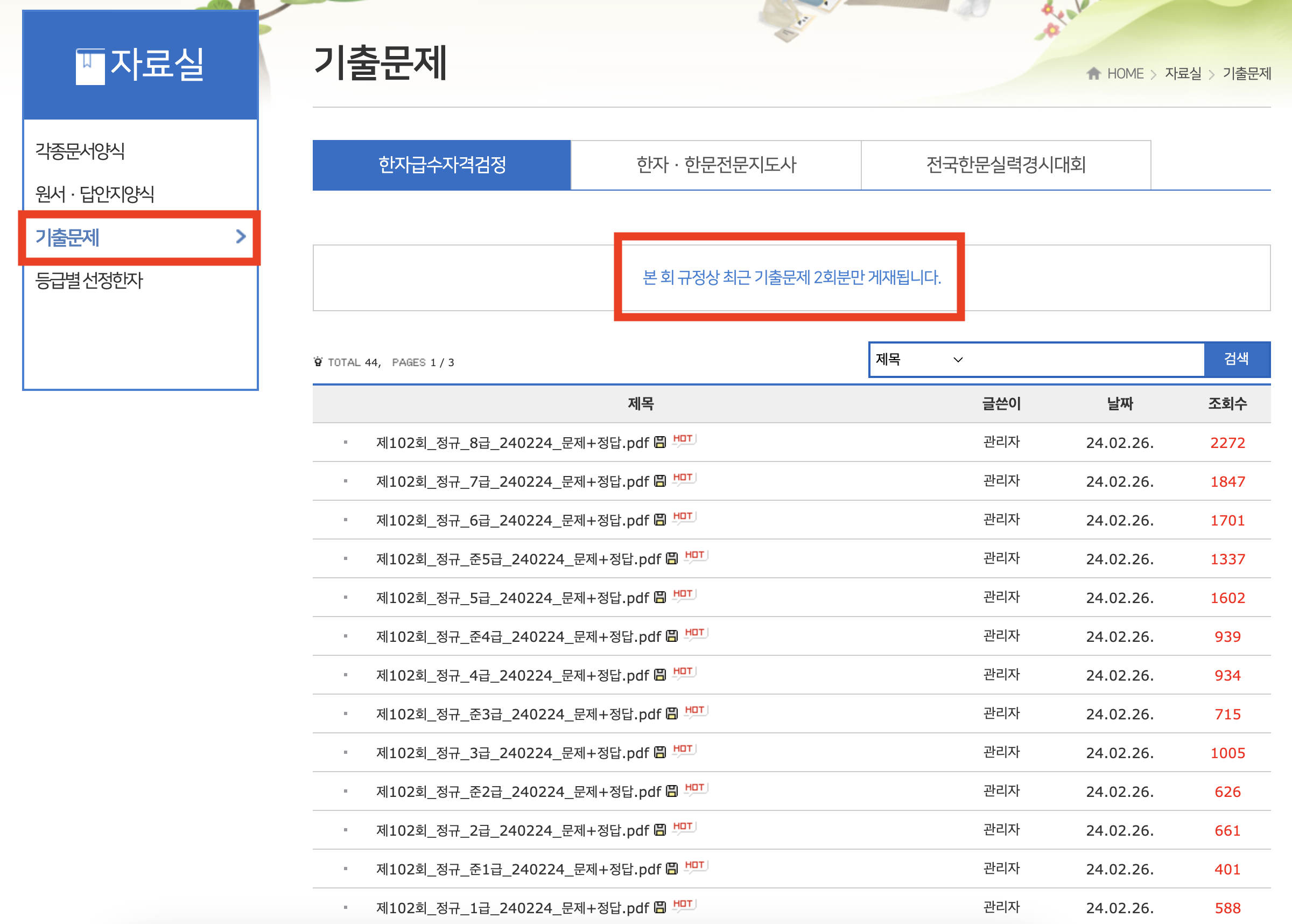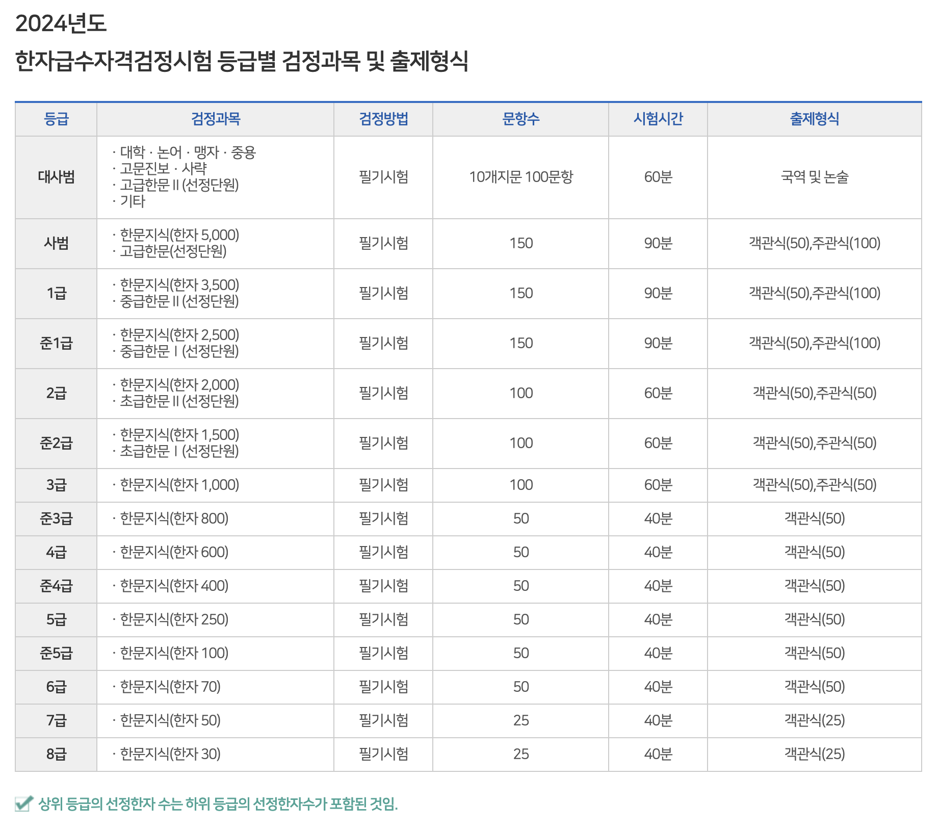 등급별 한자수와 문항수 확인해보셔요!