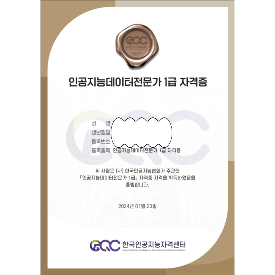 안녕하세요. 1월에 치른 인공지능데이터전문가 1급 자격증 AIDE 1급을 합격하고