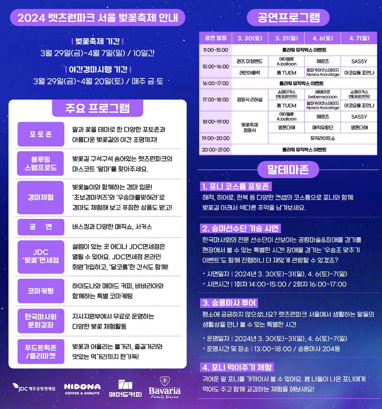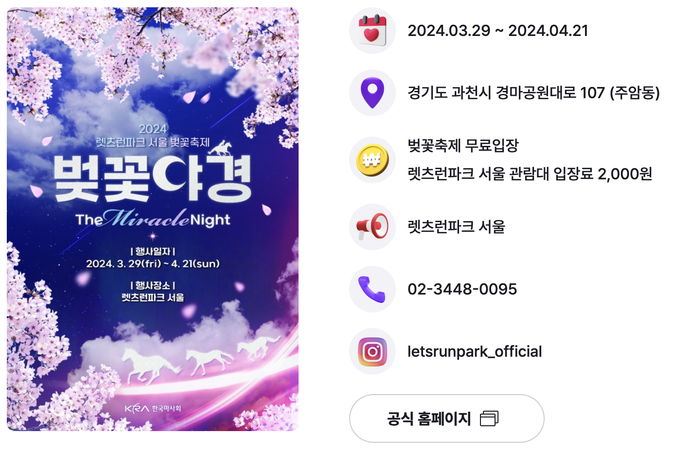 요금 : 벚꽃축제 무료입장 / 렛츠런파크 서울 관람대 입장료 2,000원