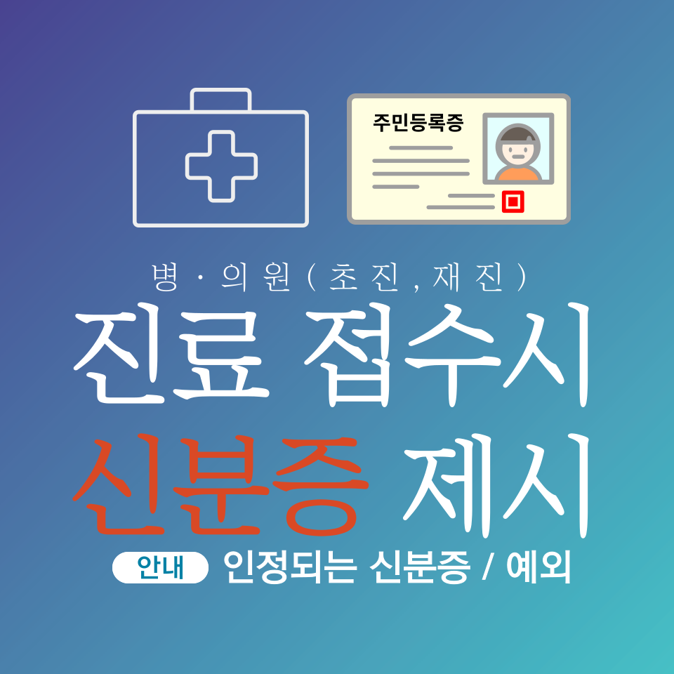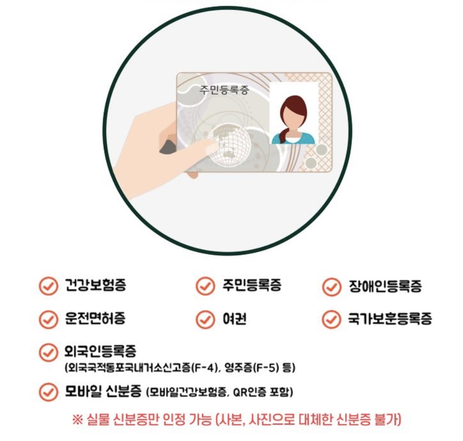 ① (신분증) 건강보험증, 주민등록증, 운전면허증, 여권, 국가보훈등록증, 장애인등록증, 외국인등록증, 국내거소신고증, 영주증 등