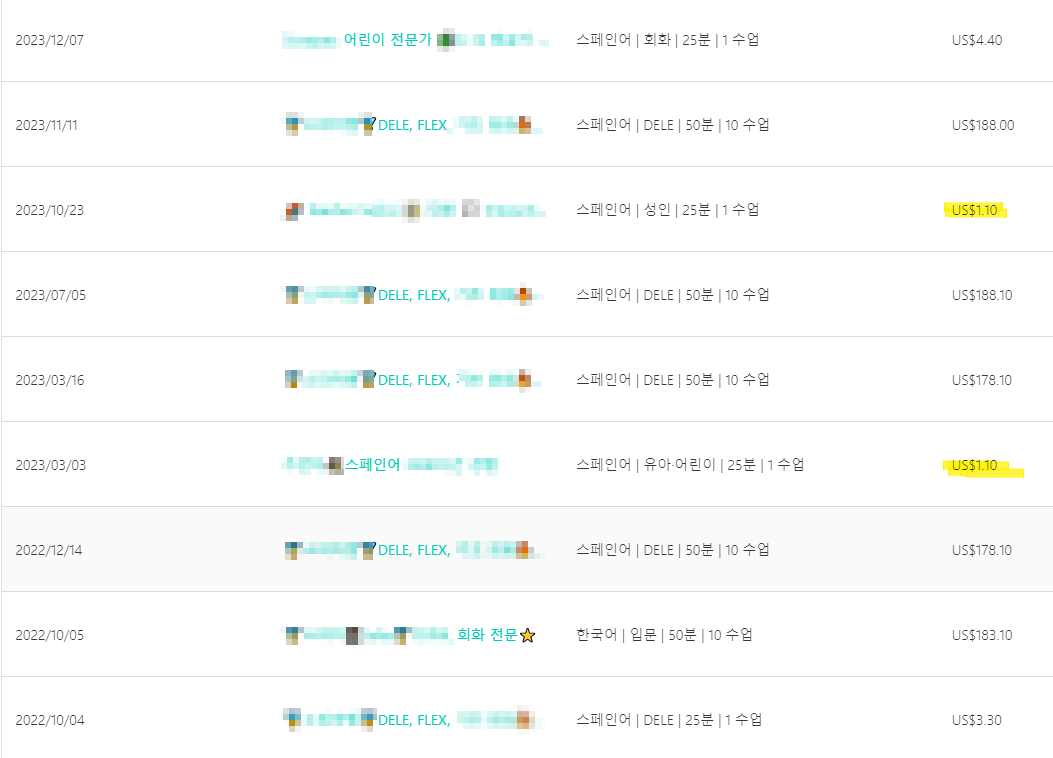 저는 스페인어 주 1회 50분 수업을 하나씩 진행하고 있습니다.