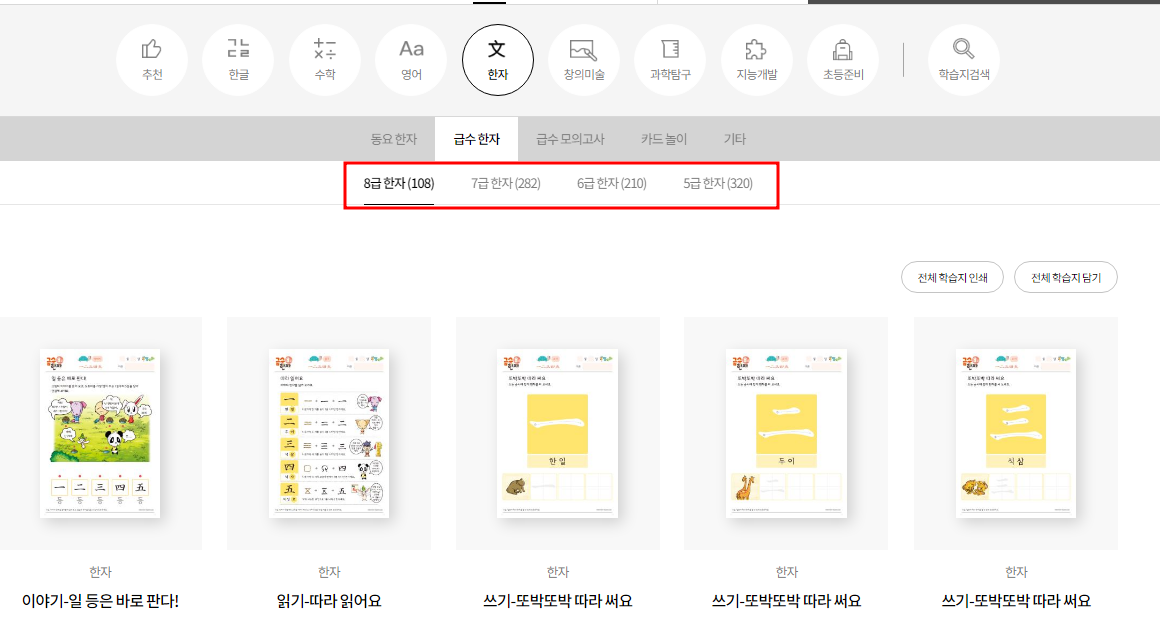7,8급 한자 자료는 많잖아요. 여기는 5급까지 자료가 있습니다. 따로 문제집이 필요 없어요.