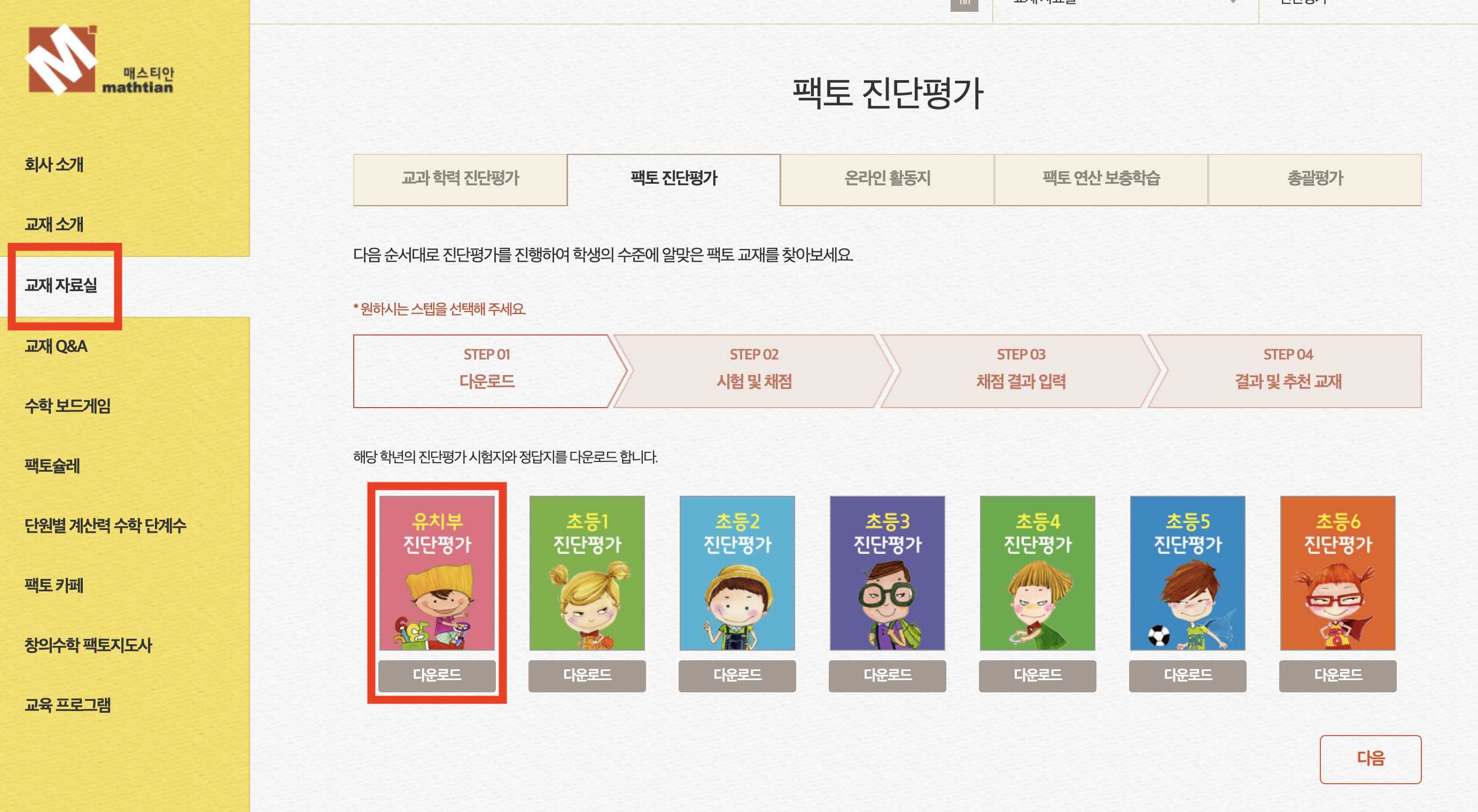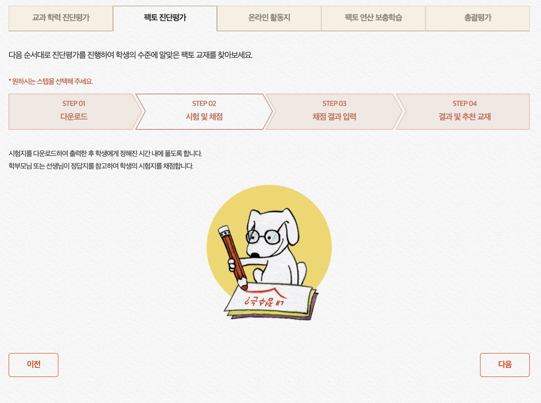 [다운로드]- [진단평가 풀기] - [채점] - [채점 결과 입력 ] - [결과 및 추천교재 ]