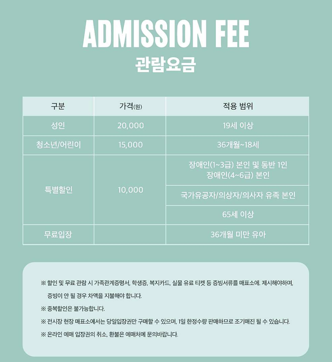 • 관람료 : 성인 20,000원 / 청소년, 어린이 15,000원