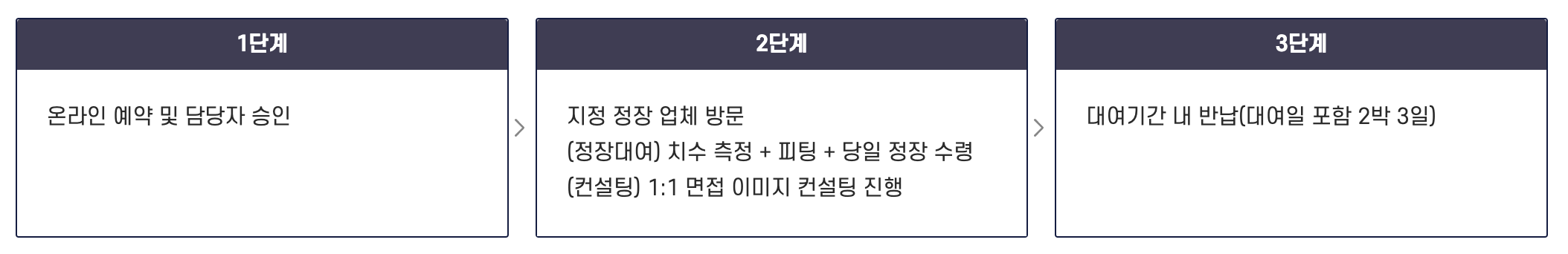 온라인 예약 및 담당자 승인-> 지정 정장 업체 방문 -> 대여기간 내 반납(대여일 포함 2박 3일)