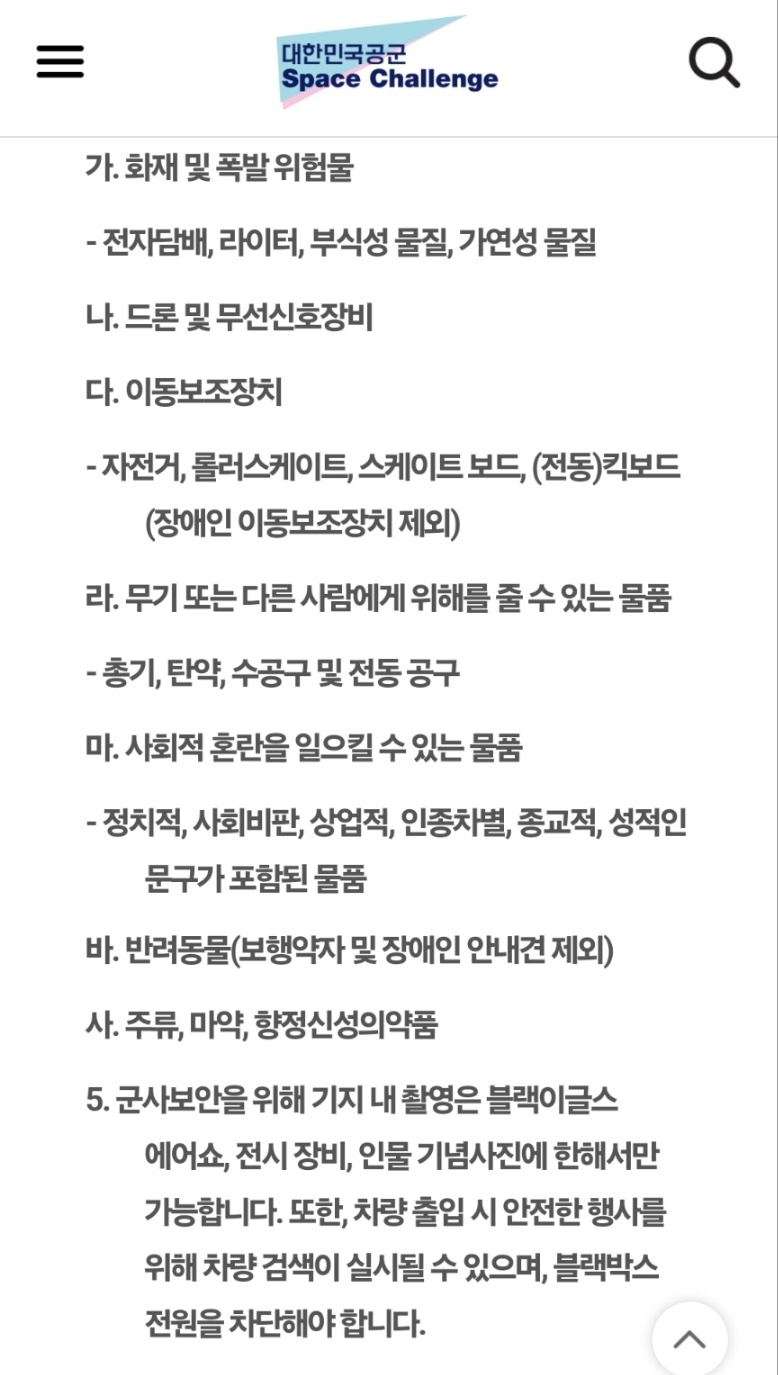 홈페이지에 나온 반입금지 물품입니다