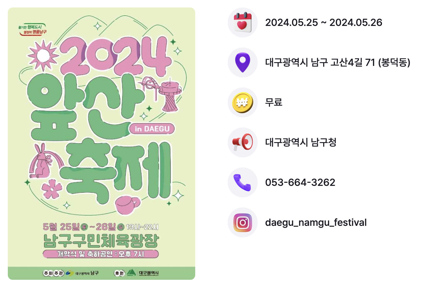📌 장소 : 대구광역시 남구 고산 4길 71(봉덕동) 남구 구민체육광장