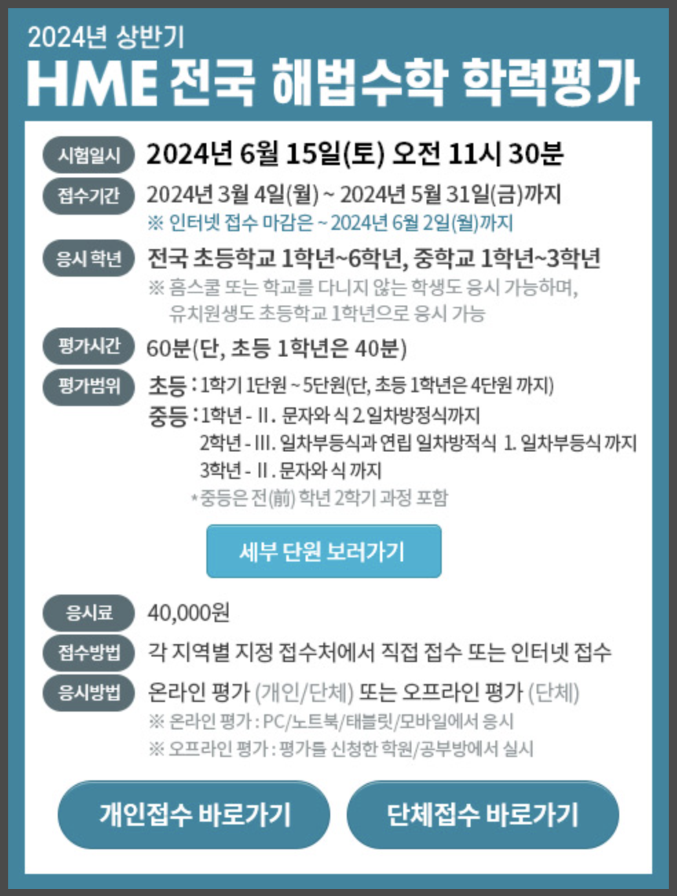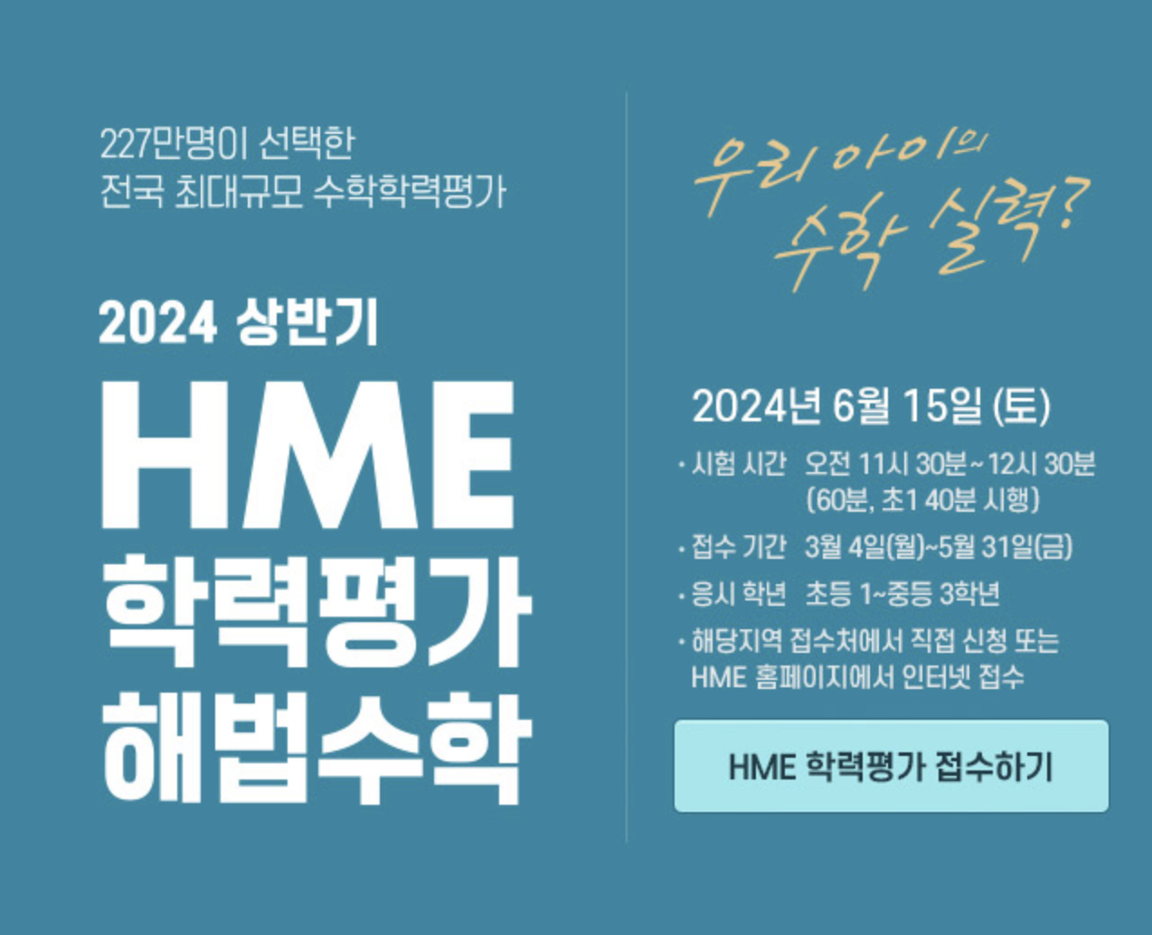 | HME 해법수학 학력평가 | 2024년 3월 4일 (월)~ 2024년 5월 31일(금) 인터넷접수 6월 2일(일)까지 |