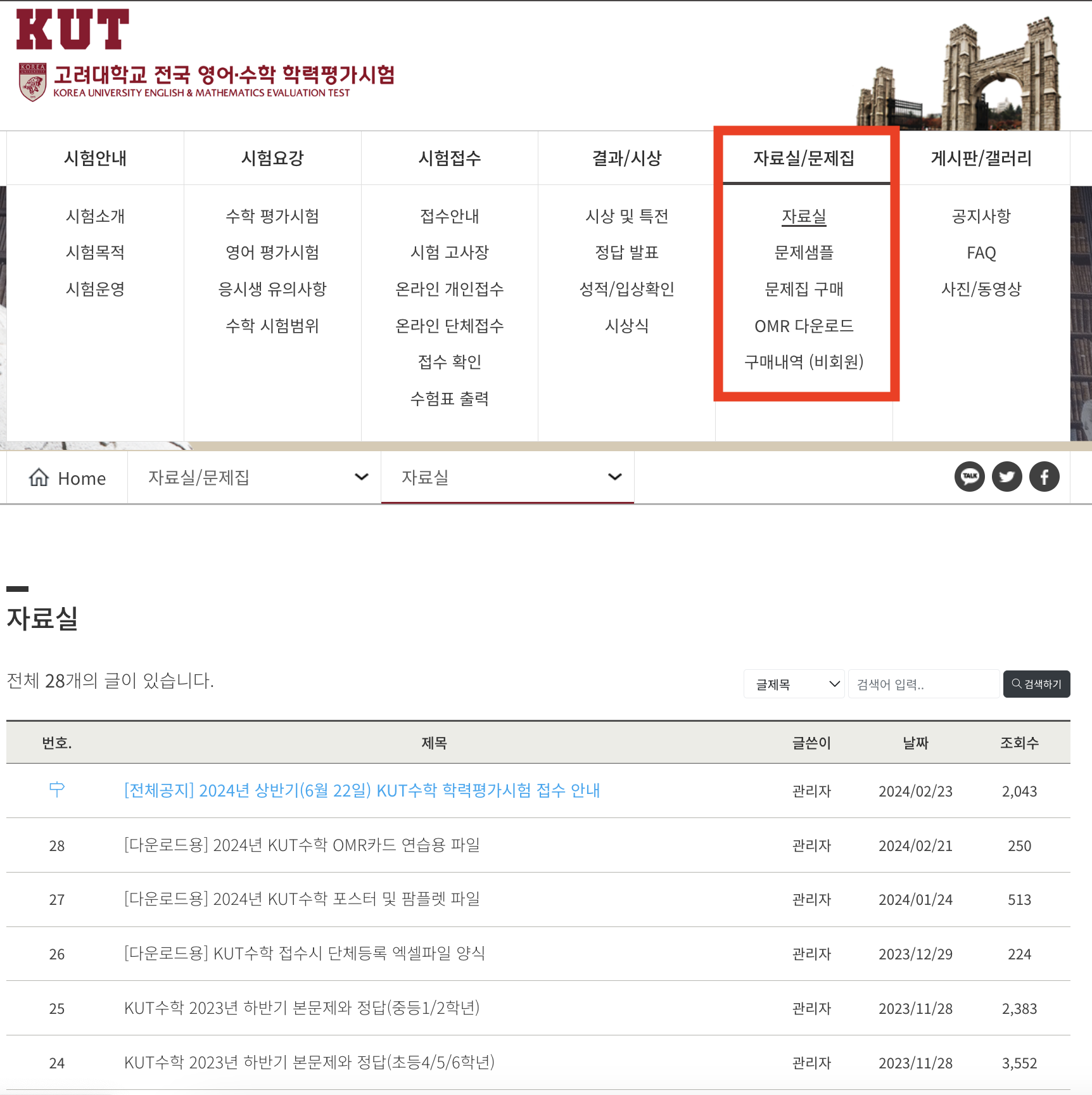 | KUT 고려대 수학학력평가 | 2024년 2월 19(월) ~ 5월 31일(금) | 2024년 6월 22일 토요일 13:30 ~ 14:50 (80분) |