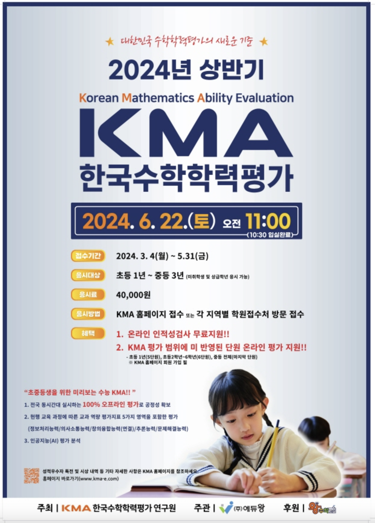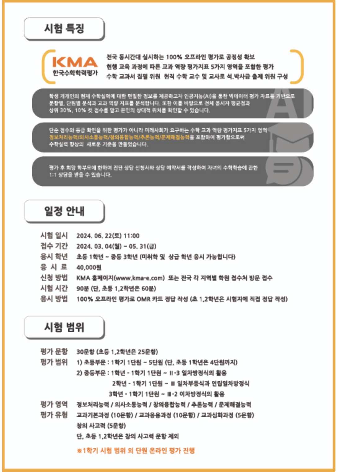 | KMA 한국수학학력평가 | 2024년 3월 4일 (월)~ 2024년 5월 31일(금) | 2024년 6월 22일 토요일 10:30분입실 11:00 시작 |