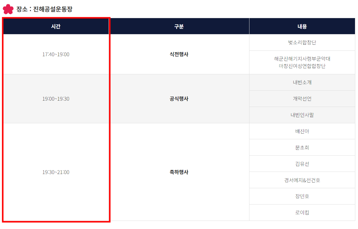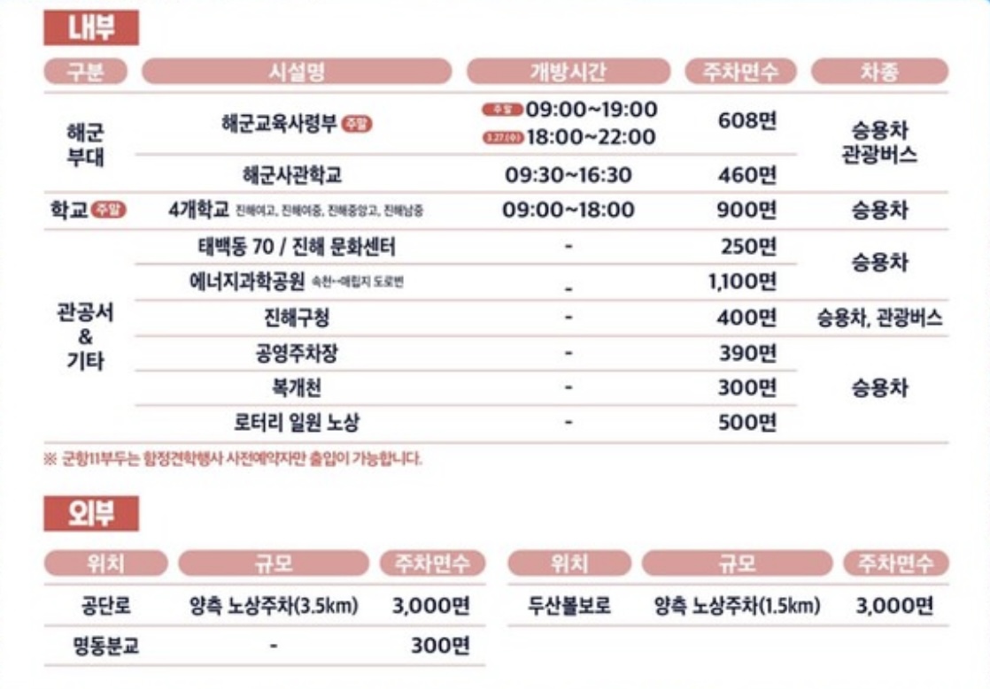 10. 군부대 개방행사: 3.23(토) ~ 4.1 (월) 장소 해군사관학교, 진해기지사령부, 군항11부두, 미해군진해부대