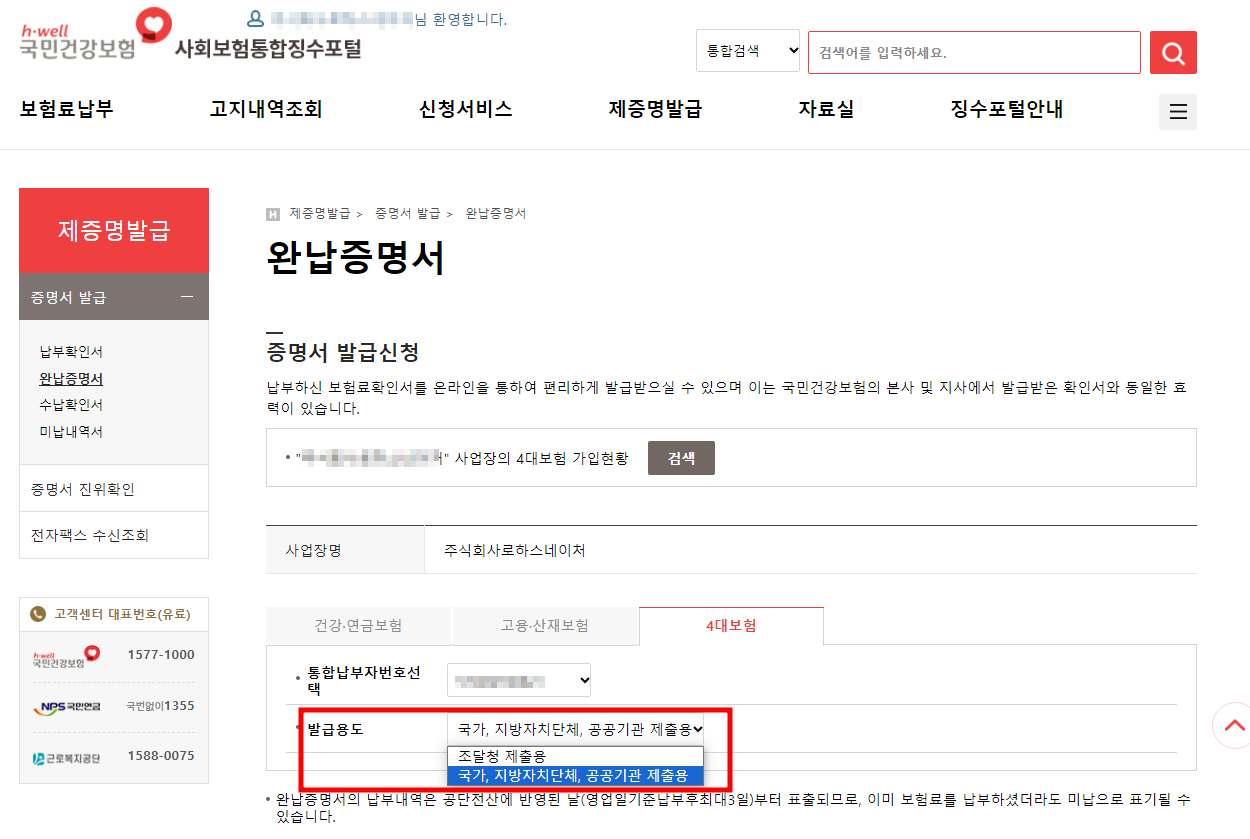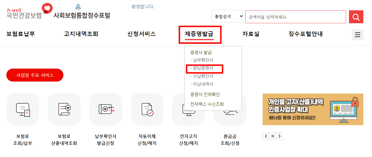 **개인 완납 증명서 : 건강 ,연금 보험만 발급 가능
