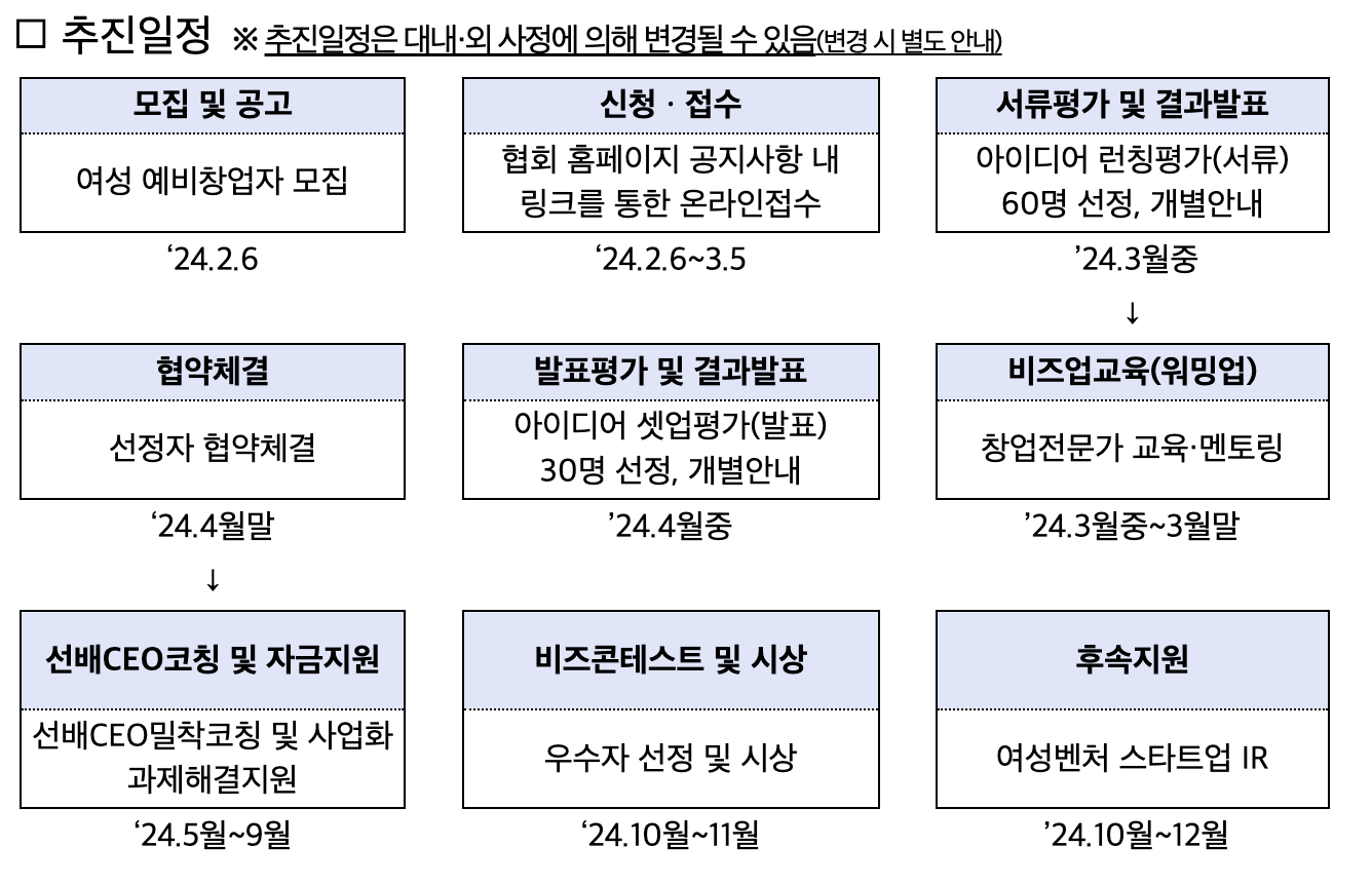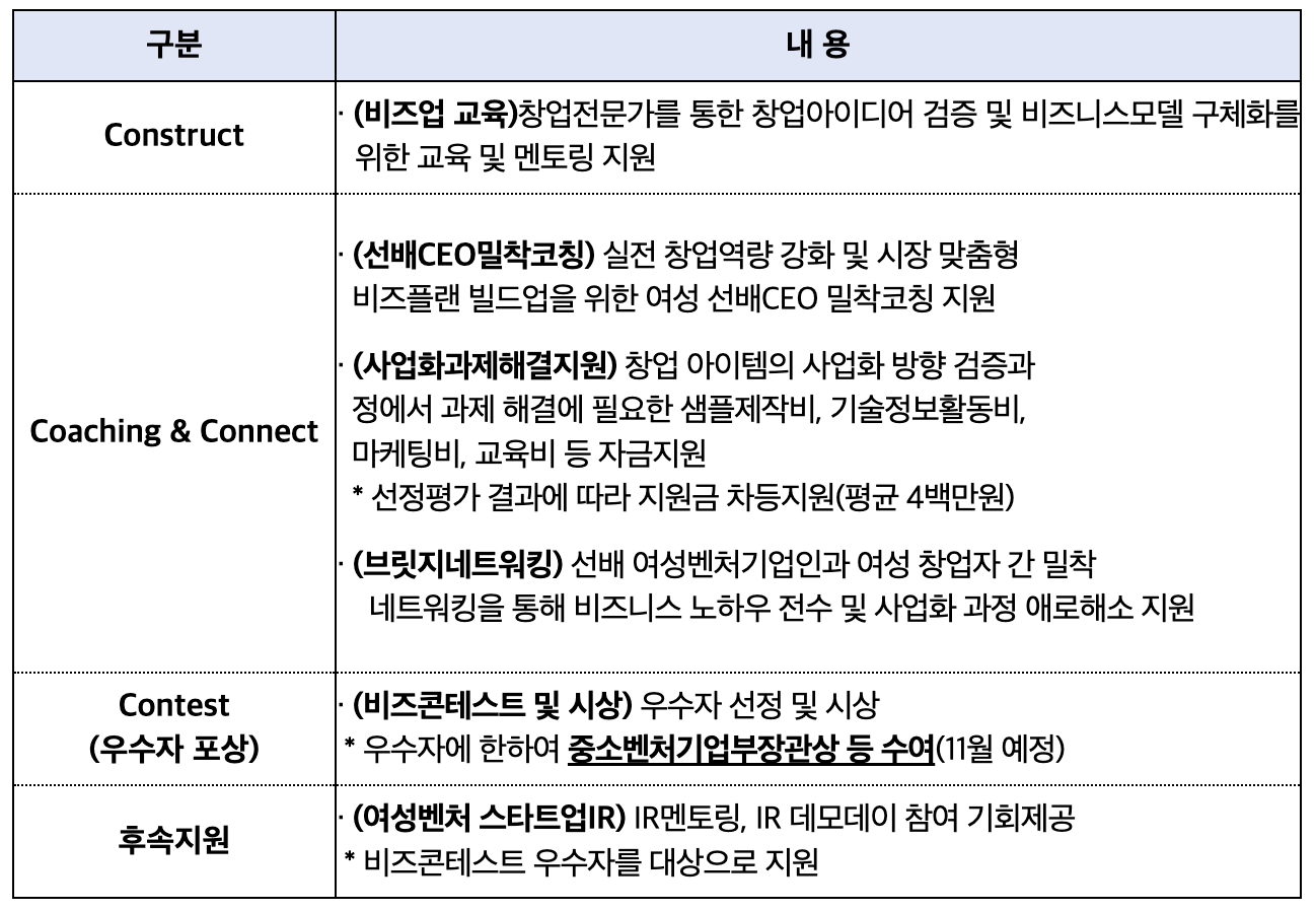 ◦ (지원내용) 우수자 포상, 비즈업 교육, 창업전문가 멘토링, 여성벤처선배여성벤처선배 CEO 밀착코칭, 창업사업화 과제 해결에 소요되는 자금을 평균 4백만 원백만원 지원 등