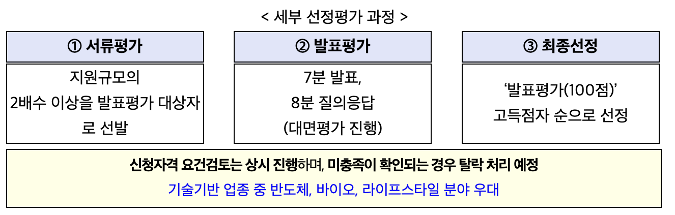 ◦ (평가방법) 총 15분 대면발표(7분 발표 / 8분 질의), 평가표에 근거하여 제출된 사업계획서 및 발표자료를 중심으로 대면평가 실시